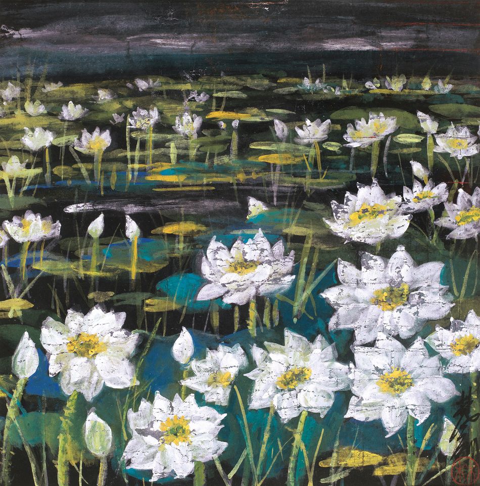 此件作品《蓮花圖》則呈現了林風眠創作國畫山水之後,以光和色彩並重的畫風,其西畫修養與透視法、光影明暗對比的呈現,將畫面中的空間感作最大的發揮,即使滿塘盛開的荷花錯落於前後、遠近,都帶有繁中有序不至凌亂的視覺效果,在簡單的構圖中,盛開的荷花以寧靜之姿躍為主角;水與岸的平直,及荷花花瓣重複的造型,都是出自巧妙安排,這些元素在畫面上形成了一種祥和的統一,而這種多樣的統一中,形狀的相似性,光和色的變化及平面空間裡的分割,都起了和諧的作用。