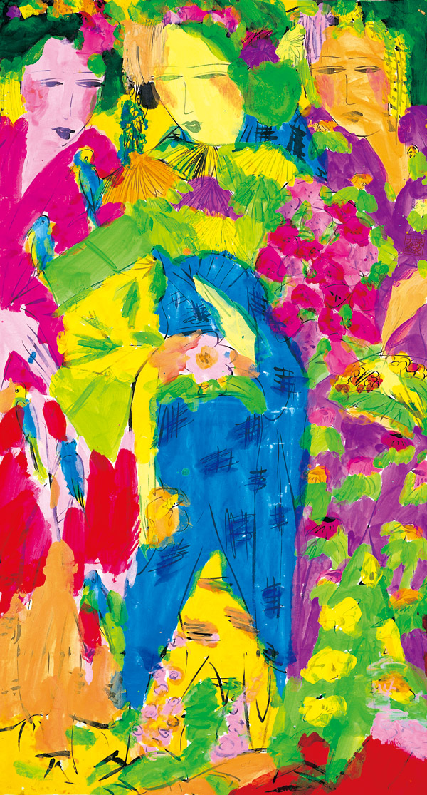 丁雄泉早年在巴黎創作時期,馬蒂斯的繪畫曾帶給他很大的影響,使他偏愛亮麗的色彩與鮮明的對比。除此之外,來自於中國民間彩繪的影響,亦使他對瓷土的淨白、設色後的自然與營造出的透明感情有獨鍾。1970年代後期,丁雄泉獨特的創作風格日漸形成,融入「中鋒」的書寫動作及狂草的律動,他以書法的筆觸勾勒輪廓,再汲取中國版畫的技巧,以艷麗的壓克力彩平塗線條內的空間,自然優美卻又瀟灑暢快。