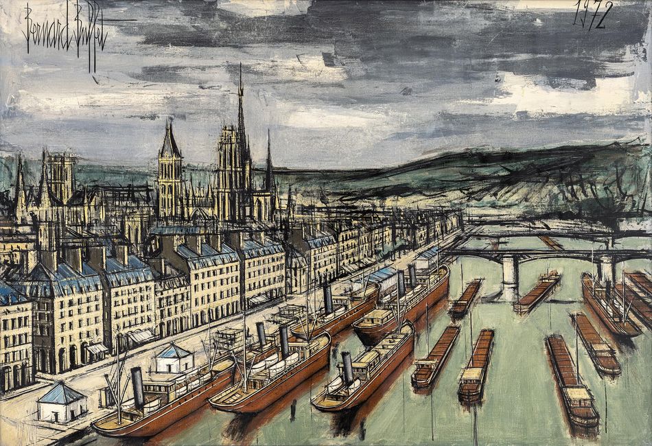 此次拍品畢費《盧昂商埠與駁船》為藝術家1972年「船隻」系列風景畫作。藝術家以橫幅,如雄鷹空中俯瞰的視角構圖此作。該系列作品數量稀少,集中於1972-1973年畫就,描繪70年代法國工業發展與海運貿易的鼎盛景象。構圖嚴謹精緻、薰染上金棕色調的船隻系列,象徵著畫家進入成熟時期的創作高峰。《盧昂商埠與駁船》畫面中如同炭精的黑色線條,繁密且精巧的粗細交錯,構築出建築物與具象風景元素。一艘艘拖船依序列隊,低鳴著從遠方駛來,牽引著載滿貨櫃的大型駁船。河岸旁商埠建築比鄰而立,遠處的大教堂尖塔聳立,在工業化與歷史之間見證著城市的變遷。空無一人的景象,因密集的筆觸帶出一種略帶激盪的現代感,也許正是藝術家對於商埠繁華與歷史流轉的靜默凝視。