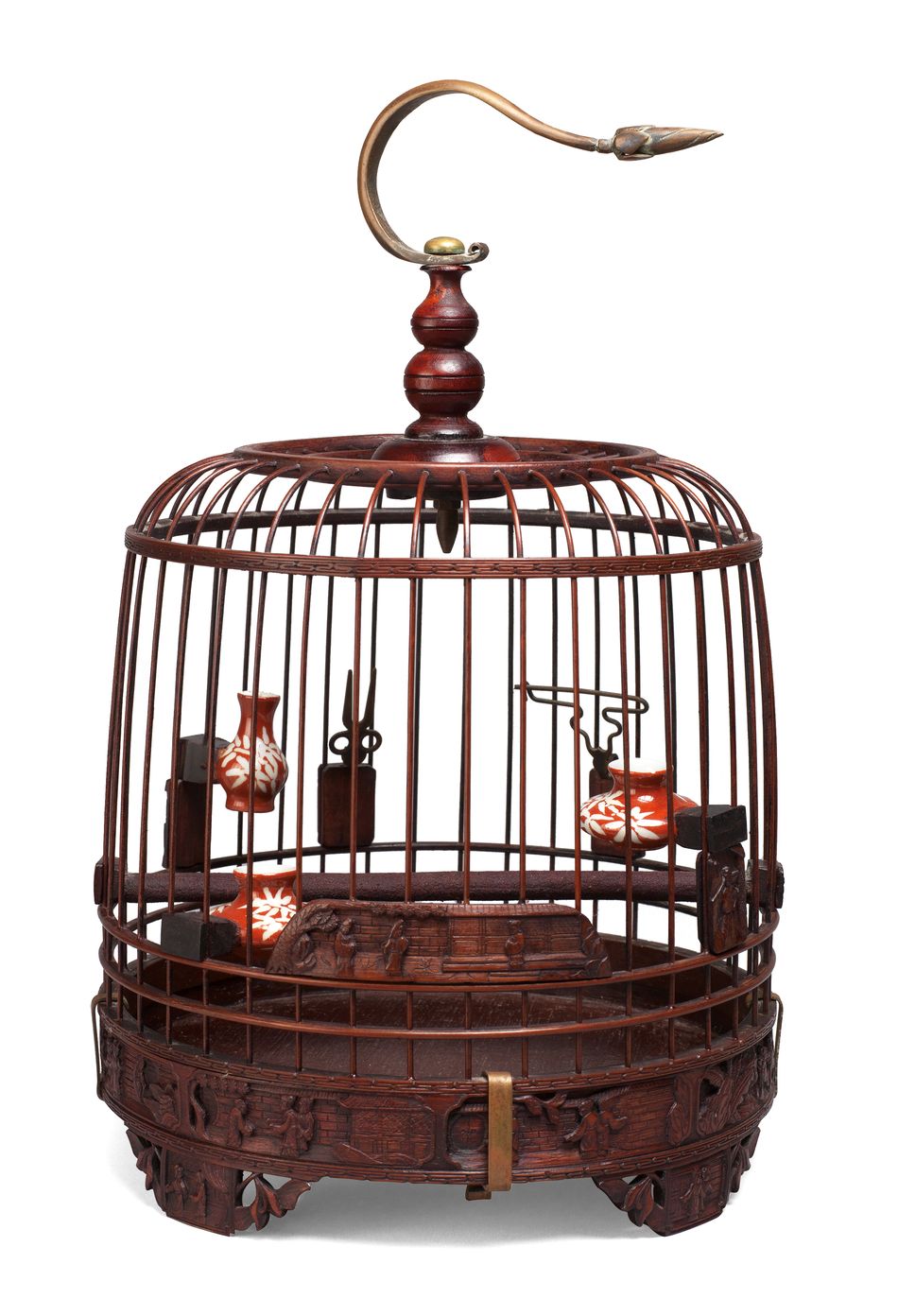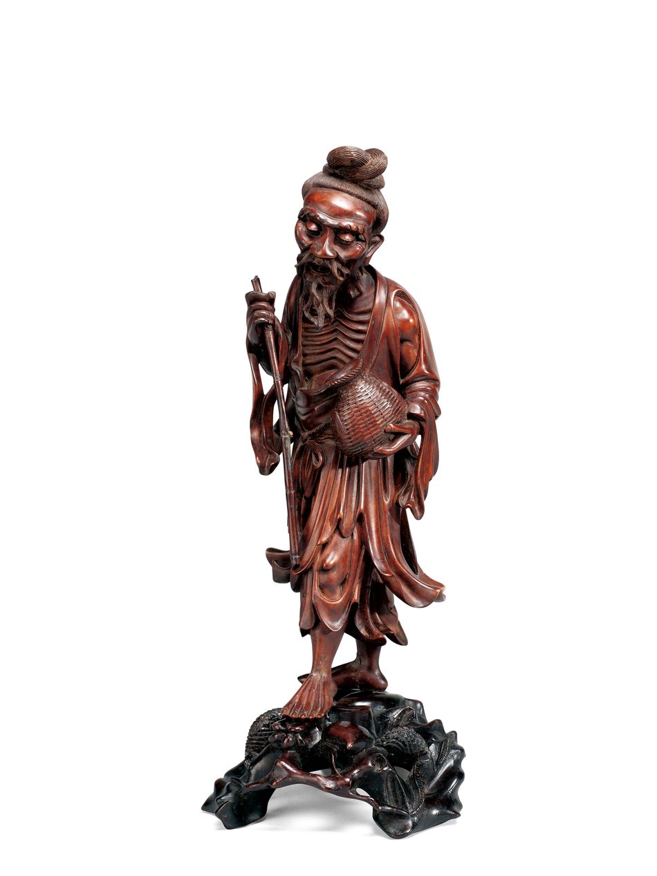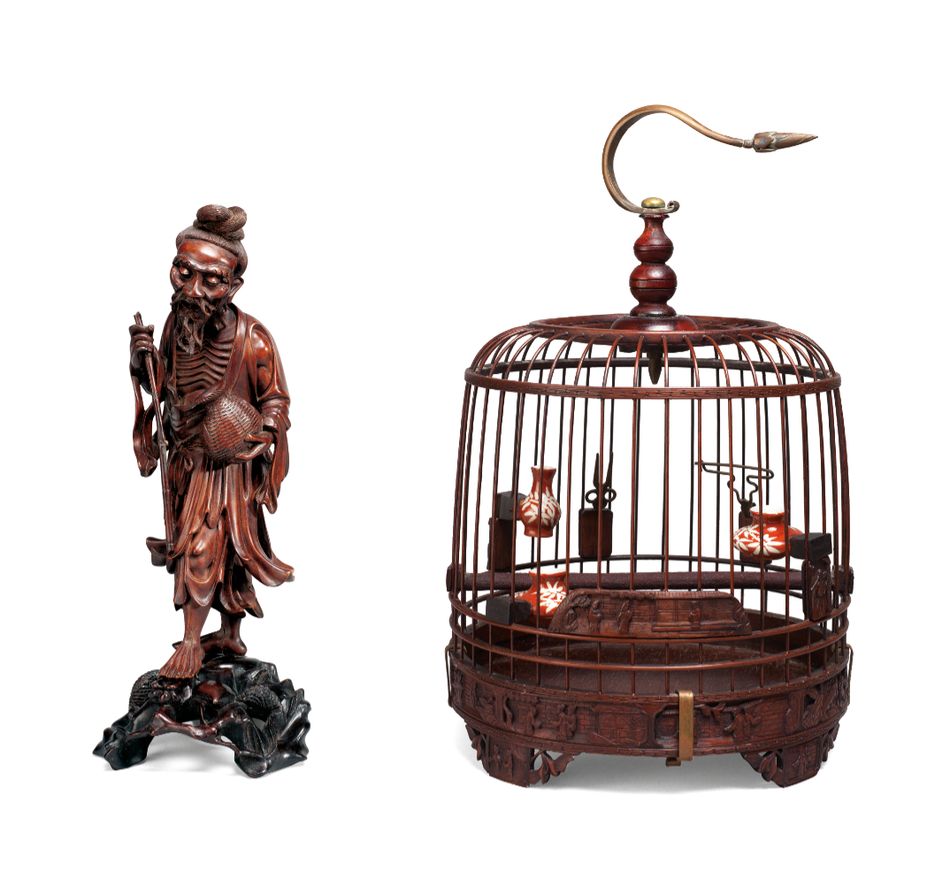 19世紀 黃楊木雕漁翁及竹雕鳥籠 (兩件一組)
