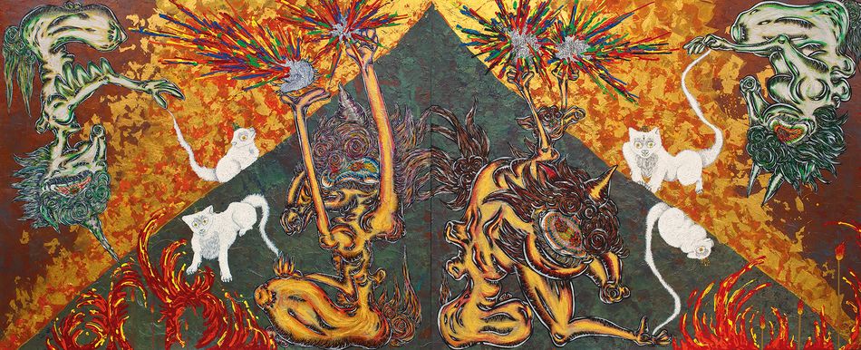 《紐約「感」與「想」;香港「感」與「想」(雙聯幅)》為市場罕見的雙聯幅作品,金字塔式構圖,以飽滿的金黃色和墨綠色打底,用墨、壓克力顏料等各式媒材堆疊,以打圈、並列、粗獷而又充滿張力的線條和自由奔放的筆觸描繪畫面。畫面中央兩隻神獸,獨角與雙角。由金、墨切割的畫面有如切割陰與陽的界線,四周端坐著四隻潔白色的犬,眼神又帶點溫柔。整幅畫面構圖平衡而又和諧,色彩飽滿而又明亮豐富,栩栩如生又充滿靈性。在藝術家的畫筆下,守護獸們象徵著神靈,傳達了一種守護力量和正能量,也是保護人類和平的守護神。