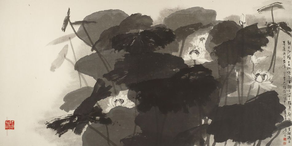 此幅《墨蓮圖》巨大的尺幅的潑墨蓮花,磅礴大氣,筆法豪放圓潤,突出蓮花的多元姿態與墨韻變化。右側題上唐代張潮的〈採蓮詞〉刻畫一群採蓮女朝起暮歸,乘坐著小小的蓮舟不畏狂風惡浪,勤勞工作,襯托蓮花出淤泥不染的清高本質。面對這疾風惡劣的環境,採蓮女團結一致抵抗風浪,展露出女性的堅毅,她們在亂世中可能稍微花容失色,卻又帶點嫵媚的英姿,沉著的意志。全幅構圖疏密有致,格調獨具一格,黑白的用色更顯墨韻的變化,畫面更顯清新典雅。全幅荷葉大方舒展,墨韻濃淡相間有序,近景以濃墨枯筆散鋒掃出,破筆揮就,中後景以濕筆側鋒落筆敷染,兼以碑體書法的筆勢營造出柔中帶剛的效果,墨色淋漓中顯蒼勁,讓蓮蓬蓮葉輕如浮雲卻又重如崩瀑。明代畫家徐渭於〈五月蓮花圖〉寫道 「五月蓮花塞浦頭,長竿尺柄揮中流。縱令遮得西施面,遮得歌聲渡葉否。」以蓮喻君子,君子的清高正直不被繁繞亂世所掩蓋。縱使蓮葉亂蓬失色,在驟雨疾風之下,花蕾自空隙冒出,各自亭亭玉立,數朵冒起,更顯蓮花空靈蘊秀,香遠益清。蓮花以淡墨中鋒疾筆白描蓮瓣,姿勢各異,或是飽滿綻放,或是含苞待放,如採蓮女一樣,各自在疾風顛簸的環境展露高雅嫵媚,襯托君子中通外直、堅毅不移、高潔正直的特質。