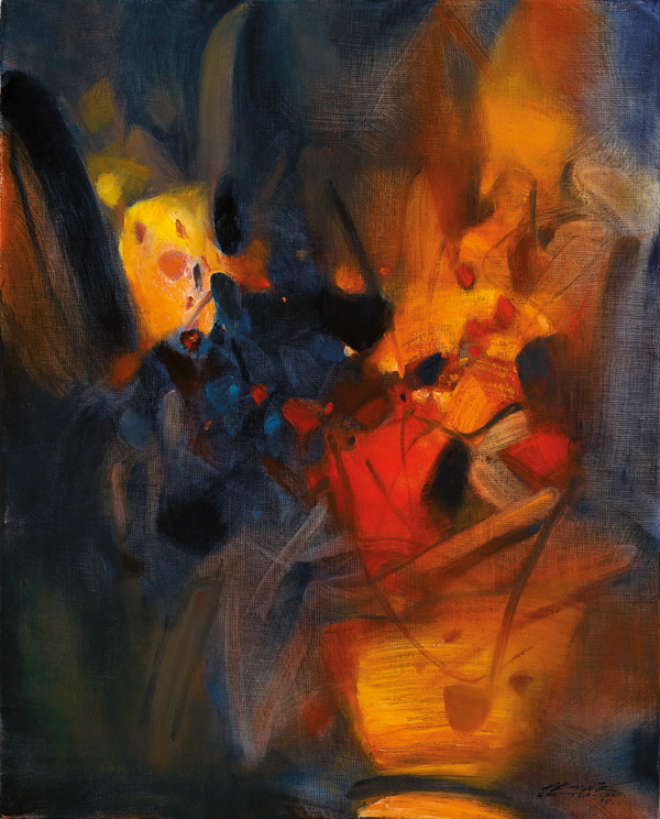 朱德群的抽象繪畫風格發展至1980年代已臻至成熟,本次參拍作品《抽象組合》繪於1995年,藝術家大膽揮霍色彩,深色的虛無沉寂、橘紅的激越高昂。色塊並列對比,在幽暗不明之後彷若有光,在陰影膠著之際,依然可觸及屹立不搖的溫暖與熱情。大排筆刷縱橫交會,飛白的筆觸堆疊出延伸的空間深度,濃淡層次的幻化之間,創造出光影的晦冥變化。呼應著朱德群對其創作所下的註解,在他的畫面上,色彩與線條的安排絕非隨機所致,兩者和諧相輔,召喚出形象與律動,創造如活水般的激湧光源。