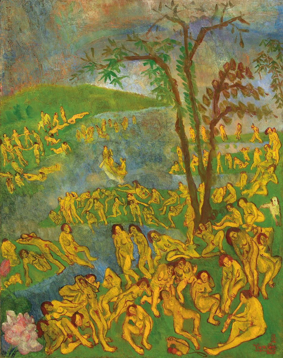 《百美戲浴圖》曾著錄於2014 年河北教育出版社出版的「世界名畫家‧ 朱沅芷」專冊。此圖長寬91 x 72 公分,直幅畫面左上落款題名:百美戲浴圖 芷沅 藍五洲;而右下對角則以法文簽名:沅芷 Yun Gee Paris mi de nuit 29。整體畫面採中式S 形構圖法,從左下的粉色菡萏開啟,順著畫中溪流的方向,從前景向中段與後景延伸,構成縱深方向的空間關係,營造生動視覺感。細數畫中人物,整整一百位姿態各異的裸體女像,有的圍圈舞蹈、潛游水中、吹奏樂器、吟詩划船,或坐或臥四肢伸展,斜倚在水岸綠坡。宛如裊裊水煙中的仙境,毫無羞赧之色,優閒自在的林中仙子。畫家以柔軟曲線勾勒人物軀體,呼應傳統中式技巧,而整體偏暗的青綠用色,及群像構圖則可見西洋古典藝術薰陶後的成果:馬諦斯《舞蹈》、畢卡索《亞維儂姑娘》、波提且利《優美三美神》。而右側三三兩兩的直木綠葉,則渾然天成地提高視角,如同漂浮於雲端,俯看這理想國度的美好景緻。