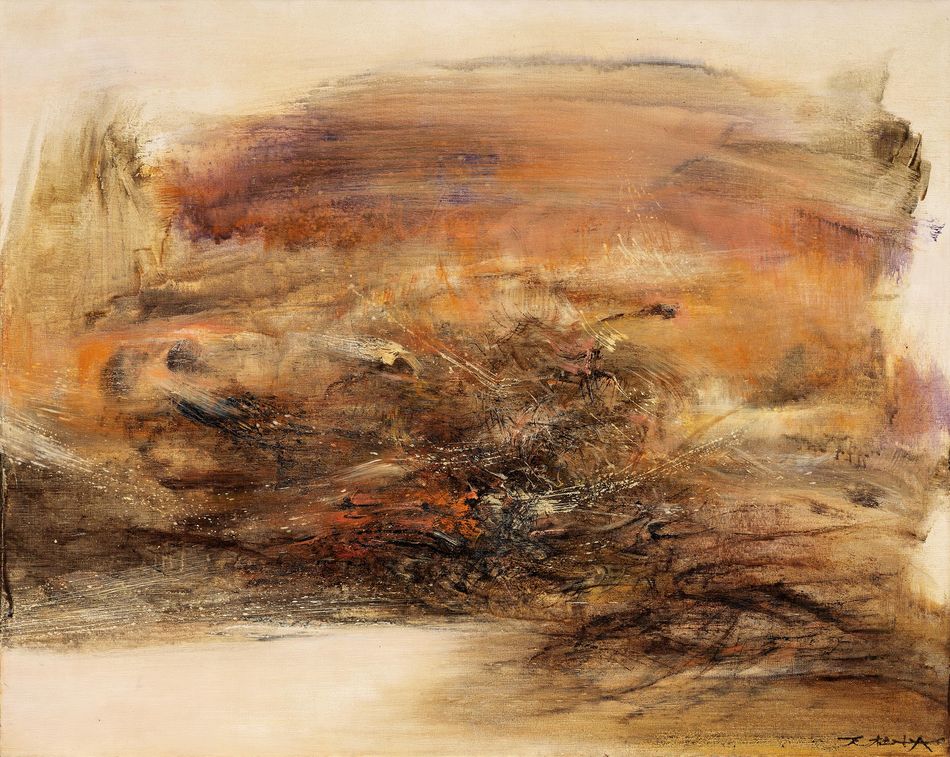 1948年後,趙無極由上海到巴黎開始他旅居法國的藝術生涯,受到當時西歐主流畫派影響,此時期的趙無極,正處於自我探索的階段,1949至1950年間,趙無極的多幅畫作已受保羅·克利作品影響。藝術家1960年代最典型的海景型橫式構圖,氣勢壯闊而生動,昇華長年繪畫之反思,再造全新的創作能量。學過六年音樂的趙無極,對於光源、空間的關切留意,以及音樂的抽象性特質,亦起了巧妙的鏈結。台灣藝術評論家杜若洲曾如此讚譽:「中國的空間」和「西方的光」是趙無極在藝術上的可觀成就之一。他不斷融合兩大文化的潛質,以其現代性的表達語彙,不僅是達到精神上的遨遊,更是締造了一個全新的視覺世界。至今仍被藏家們趨之若鶩的趙無極「狂草時期」系列。從1960至1965年,分別展覽於於最具影響力和傳奇性的巴黎法蘭西畫廊(Galerie de France)與紐約庫茲畫廊(Kootz Gallery)舉辦個展,並受邀於國際美術館參展等。趙無極曾形容那時候的自己:「我那十年全速前進,就像駕駛一輛高速飛馳的車。」綜觀「狂草時期」作品,最大特色為其畫面磅礡氣勢,構圖緊湊而力量賁張。趙無極巧妙融匯東西藝術色彩和線條之所長,實屬古往今來世界第一。尤其創作者心中抒情暢意之情懷,透過筆下妙不可言、千變萬化之運筆手法,疊加成浩然廣闊、稠迭連綿之深度空間。細觀其線條勾勒如瘦金解構,充滿力度、挺勁犀利的運筆態勢,時而激昂、時而如山川相繆,且任由觀者依循神往天地之沛然能量,感呼於渺滄海之一粟。拍品《1.6.65》屬趙無極「狂草時期」創作,以中型尺幅之標誌型橫向結構,淋漓盡致展演藝術家狂草時期之代表性繪畫特色。背景以淡赭色打底,延續1964年開