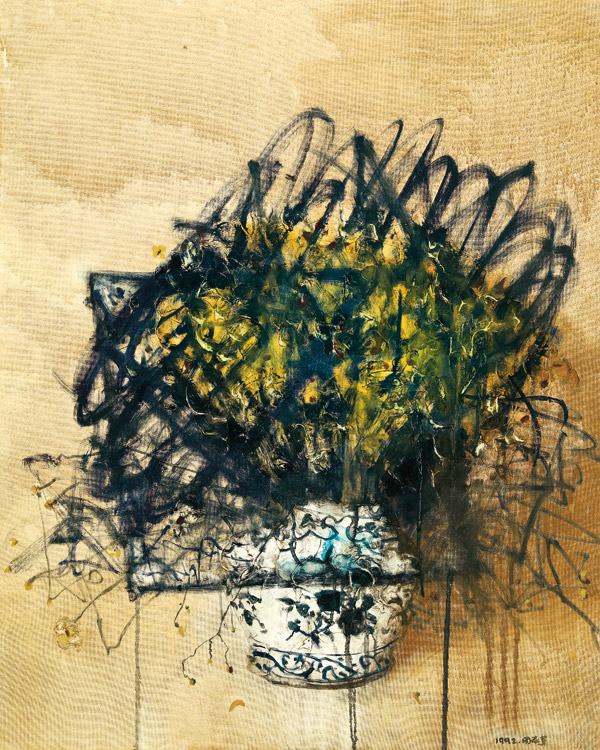 這幅1995年創作的《瓶花》畫面豐厚,不難感受到內裡迸發出的生命力和藝術家自由灑脫的創作靈性。使用油畫技法營造了恰到好處的留白,更彰顯了瓶花凝練沉著的力量和頗具德國表現主義,大格局的中國意韻,引觀者入境,通過畫面去體會藝術家或細膩或粗曠,或現代或傳統,或深沉或揮灑的無意識的言說。引發思考的同時亦抒發胸臆,讓人禁不住一再品味。