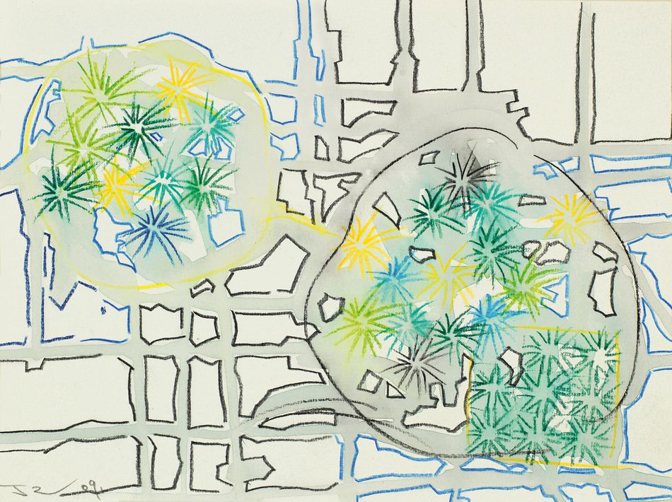 丁乙被認為是中國抽象派畫家的領軍人物。他 1983 年畢業於上海工藝美術學校,後從事玩具和玩具包裝的設計工作。由於設計時「十字」符號是圖稿上用於標示套色過程中的座標,丁乙由此逐漸在「使繪畫僅僅回到形式的本質」的理想下,形成了自己最具代表性的創作「十示」系列作品。《手稿 No.2》鮮豔的色彩如水晶球,又像俯瞰城市夜景,充滿想像與當代概念。