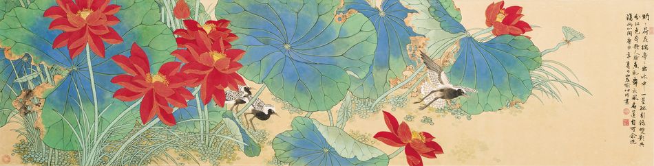 花鳥畫發展於唐代中期,群芳之中,荷花清香流傳,無雅俗之辨的焦慮,在文學或繪畫中,為歷代宗室與文人所詠賞。喻仲林承續歷史悠久之花鳥畫傳統,尤擅工筆設色,本件即作蓮池水禽之景。
