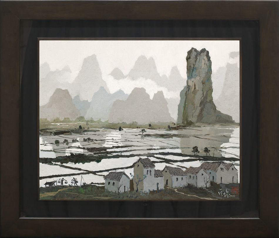 作品《山影映水田》同樣融匯了中西方的藝術哲思,是一幅飽涵中國詩詞文化,且有豐富知識學養的難得佳作。全景式構圖,描繪了桂林一帶的魚米水田之景。遠處的山影朦朧如淡墨渲染,筆法可見宋代畫家屈鼎《夏山圖》的神色在其中。畫面由遠而近作平遠之貌,千山一碧,水田蒼茫。再跟隨視線前移山勢漸陡,彷見林木蔥鬱,雲霞鎖山腰,山形步步移。近山步入眼簾,山形奇美瑰麗,酷似元人吳鎮《秋江漁隱圖》中山石的韻味——蒼茫渾厚的山水畫風,恰到好處地表現了古人歌頌山川之氣韻。筆端豪邁的氣質亦是其師黃賓虹從新安畫派的疏淡清逸,轉開學習吳鎮的黑密厚重的積墨之風格,對之後龎均在傳統技法上的影響可見一斑。