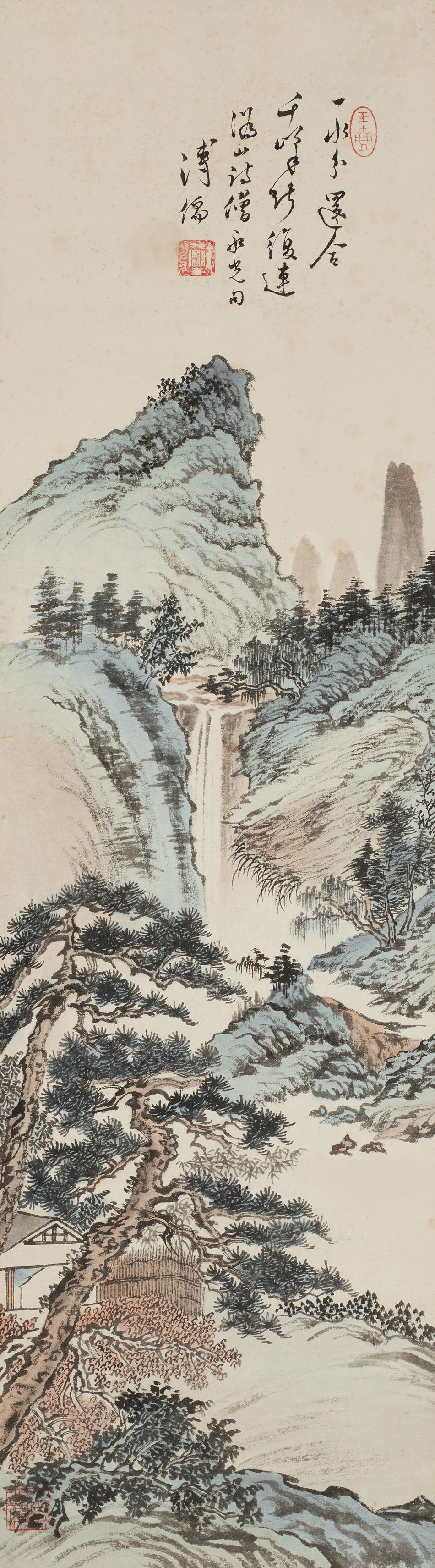 溥心畬善畫山水,雖襲古卻多有新意,1949年寓臺後的山水創作更傾向於文人畫的風格,信手寫來荒率不拘筆墨章法,揉各家之長於一身,風格具有鮮明的多樣性。《幽壑清瀑》則為典型溥氏青綠山水的風格作品,通幅工細明豔,注重線條的勾勒與摹寫,尤重於烘染設色,輕重頓挫流暢帶有節奏,意境高遠雅致;中段山形用筆快速且生動,多以鋸齒狀的線條勾出山石稜角,畫面中不安定且搖搖欲墜的山石,表現出溥氏棄國離鄉後的心境,故國山水已然不存在,只能描繪記憶中的圖面,頗有吳彬怪奇山水的奇幻畫風。近景山石塊面取自李氏青綠山水的筆意,佈局生動且淋漓挺勁,多用下重上輕的斧劈短線皴出岩石肌理,敷色則用淡赭為底罩染,石綠石青多層次的混用烘染出層次豐富的石面,深具色彩變化之美,所謂石分三面,以色做出石凹深與凸淺的陰陽面,在起伏之間析分出上實下虛做成堆石成山,後用三山夾水瀑而立的構圖做出高峻的效果,遠景以沒骨山水設色佈局,工寫兼用的自創風格在畫面組合上渾然天成;下段近景緩坡寫雙松橫出圖面並立,松下雜樹屋舍掩映,一派自然天成的風光,觀之清麗和雅,蒼莽中可見其筆墨的機趣,妙手捻來險山流水、古樹人家,溥心畬創造出高山流水、恬淡自適的絕妙景致,達到「詩中有畫,畫中有詩」的神品境界。