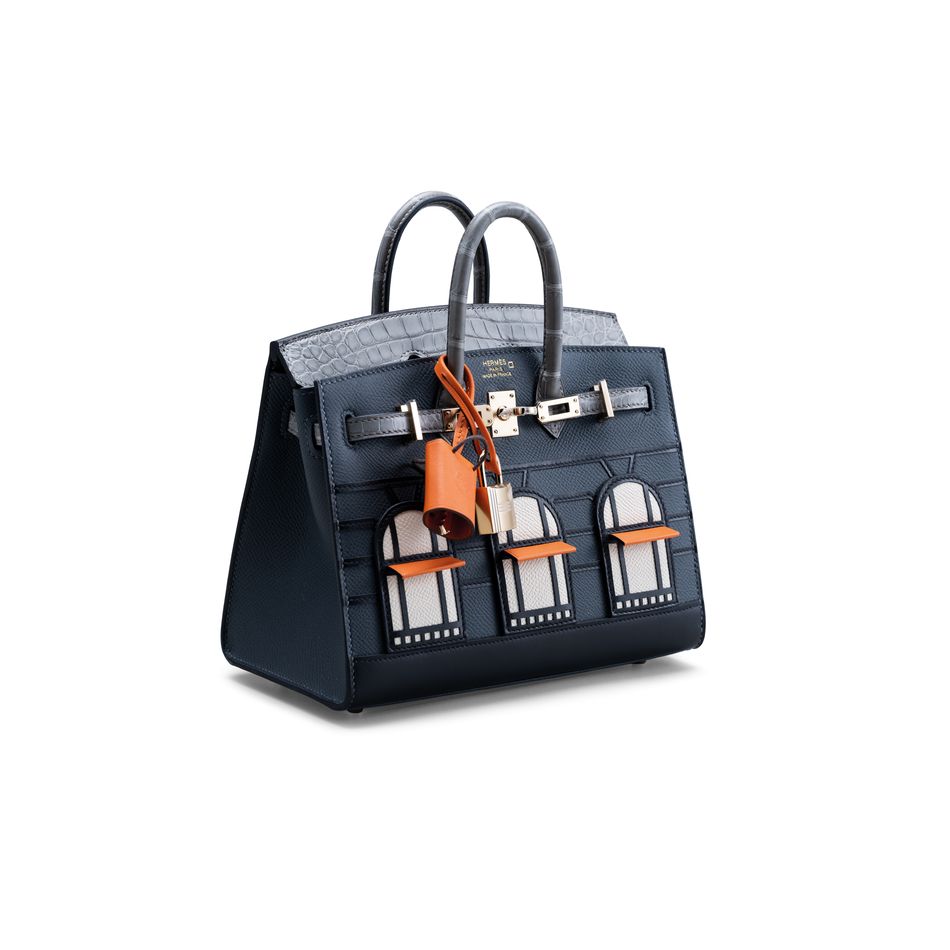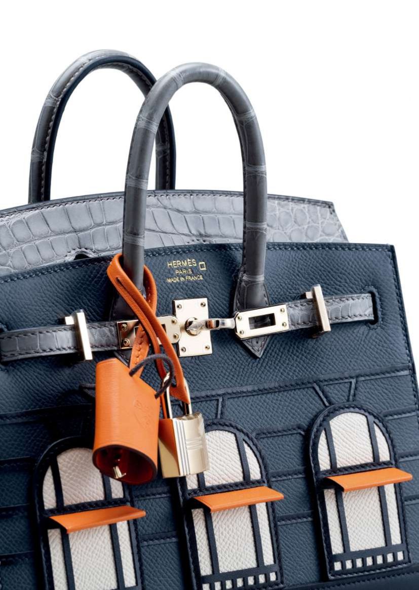 罕見霧面水晶灰色短吻鱷皮, 霧霾灰色及奶昔白色EPSOM, 橙色及黑色SWIFT牛皮20公分外縫煙雨FAUBOURG外縫柏金包附淡金色金屬配件